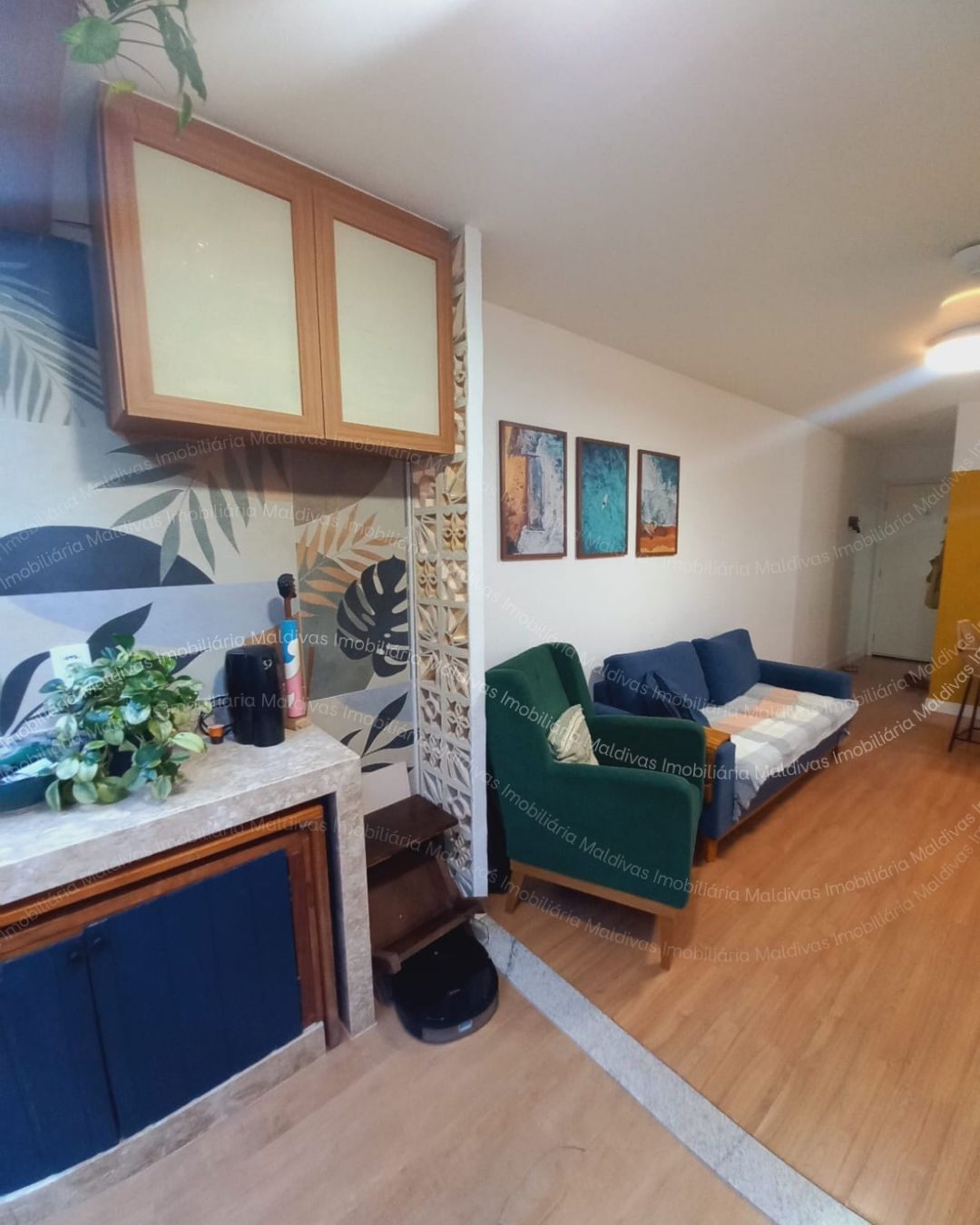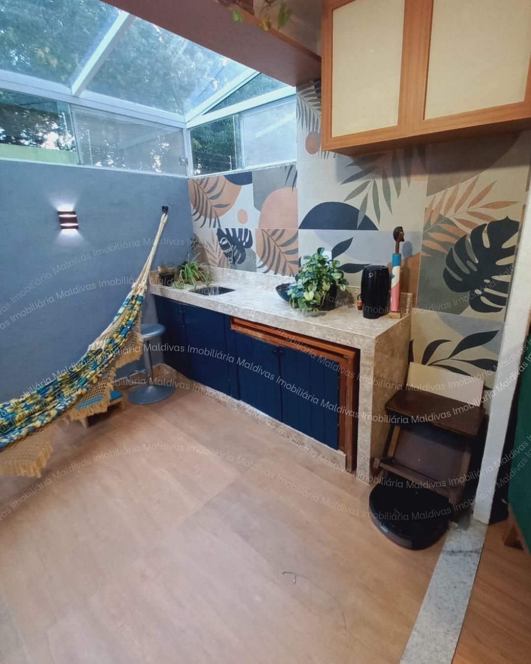 A sala tem uma mini área gourmet integrada com cobertura de vidro e uma parte aberta